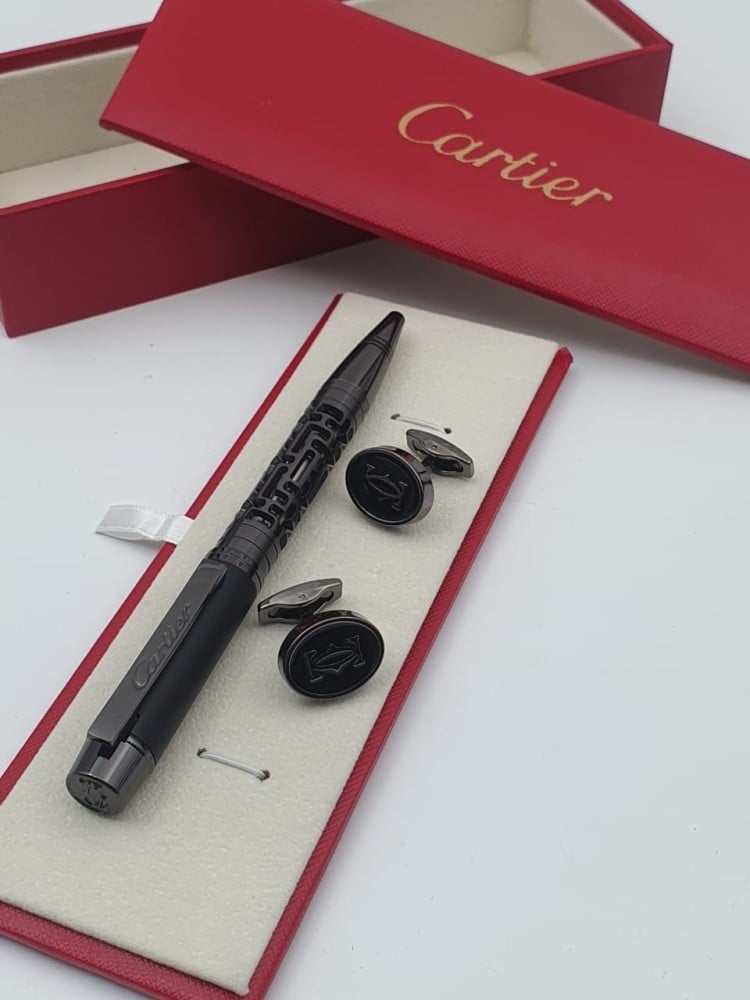 طقم فاخر من ماركة كارتير التي تعتبر من الماركات العالمية الأولى يتكون الطقم من زوج من الكبك وقلم اسطواني سميك، ويتميز هذا الطقمأنه مصمم من افضل خامات أنواع المعدن الثقيله ومن ماركة غنية عن التعريف لذلك نضمن للمستخدم بعدم حدوث صدأ أو تلف وسهلالأستخدام مما جعله أكثر استخداماً وشيوعاً.